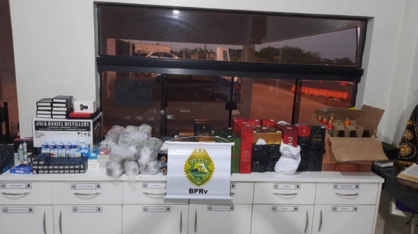 No interior do veículo e no porta-malas foram encontrados 59 litros de whisky de várias marcas, 42 cigarros eletrônicos além de vários tipos e essências para cigarros eletrônicos, mercadorias oriundas do Paraguai.