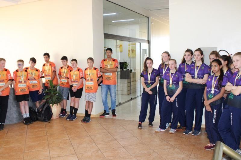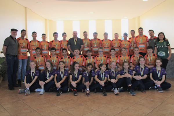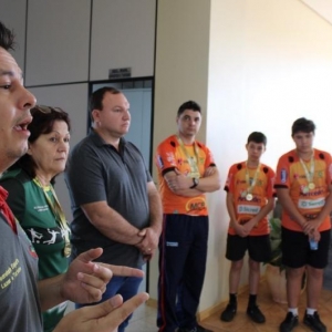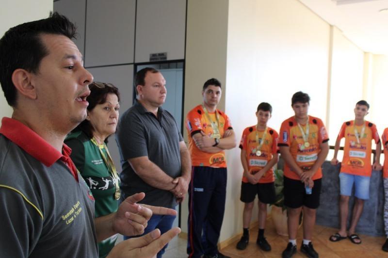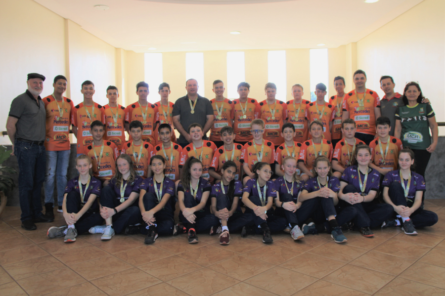 O atletas de handebol masculino (A e B) e feminino (B) do Colégio Estadual Leonilda Papen de Mercedes que soltaram o grito de “é campeão” da fase Macrorregional dos Jogos Escolares do Paraná no final de semana, foram recepcionados na manhã desta quinta (23), pelo prefeito Laerton Weber, no Paço Municipal.