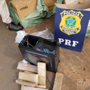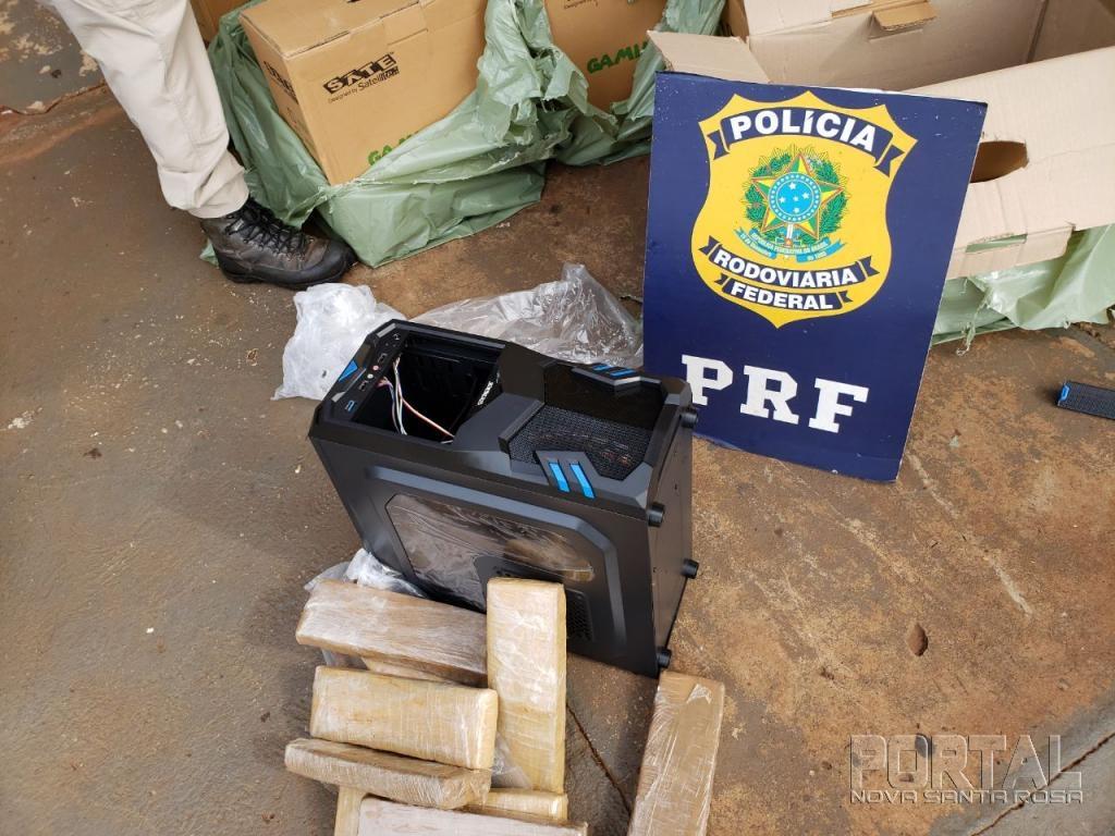 Os policiais ao averiguarem o conteúdo de algumas caixas descobriram diversos pacotes contendo maconha escondidos em gabinetes de computadores, totalizando 41,8 Kg da droga.