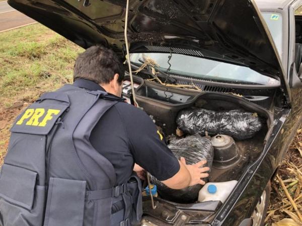 Após buscas na região, os policiais encontraram o carro, o qual estava abandonado no milharal. Ao abrir o capô do automóvel, a equipe PRF encontrou 7 quilos e 975 gramas de skank (ou skunk), também conhecida como supermaconha.