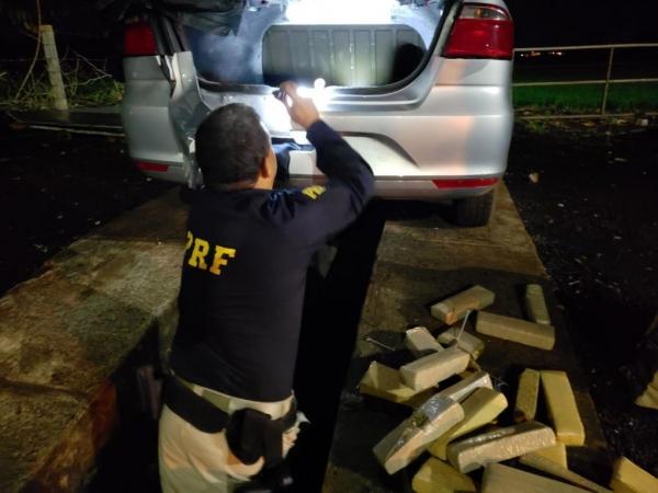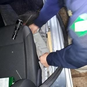 Na vistoria ao veículo foi percebido alterações na parte traseira e um forte odor de maconha. Ao proceder a desmontagem foram encontrados fundos falsos nos para choques dianteiro e traseiro, nas soleiras esquerda e direita e nas laterais do motor.
