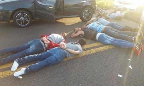 A Polícia Rodoviária Federal (PRF) recuperou, em uma única ocorrência, quatro carros roubados e prendeu sete pessoas nesta sexta-feira (16) em Alto Paraíso, na região noroeste do Paraná. Um quinto veículo utilizado pela quadrilha também foi apreendido. Roubados no Paraná, todos os carros portavam placas clonadas de modelos similares. Ao menos dois dos presos usavam documentos falsos e eram foragidos da Justiça. Entre os detidos estão cinco homens e dois adolescentes. Os integrantes do grupo foram enquadrados, a princípio, nos crimes de receptação, adulteração, associação criminosa, uso de documento falso e desobediência. Por volta de 8h50, os policiais rodoviários federais de plantão na Unidade Operacional Porto Camargo perceberam a passagem de um comboio de diversos veículos, transitando em alta velocidade pela BR-487. A equipe da PRF passou então a seguir o comboio. De imediato, dois dos motoristas, que guiavam um Hyundai HB20 e um Honda Civic, jogaram os veículos para o acostamento e se entregaram. O motorista de um terceiro veículo, um Citroen C4 Pallas, arrancou bruscamente, fazendo várias ultrapassagens proibidas. Durante a tentativa de fuga, ele chegou a bater em uma viatura da PRF, ao fazer uma manobra brusca à esquerda.