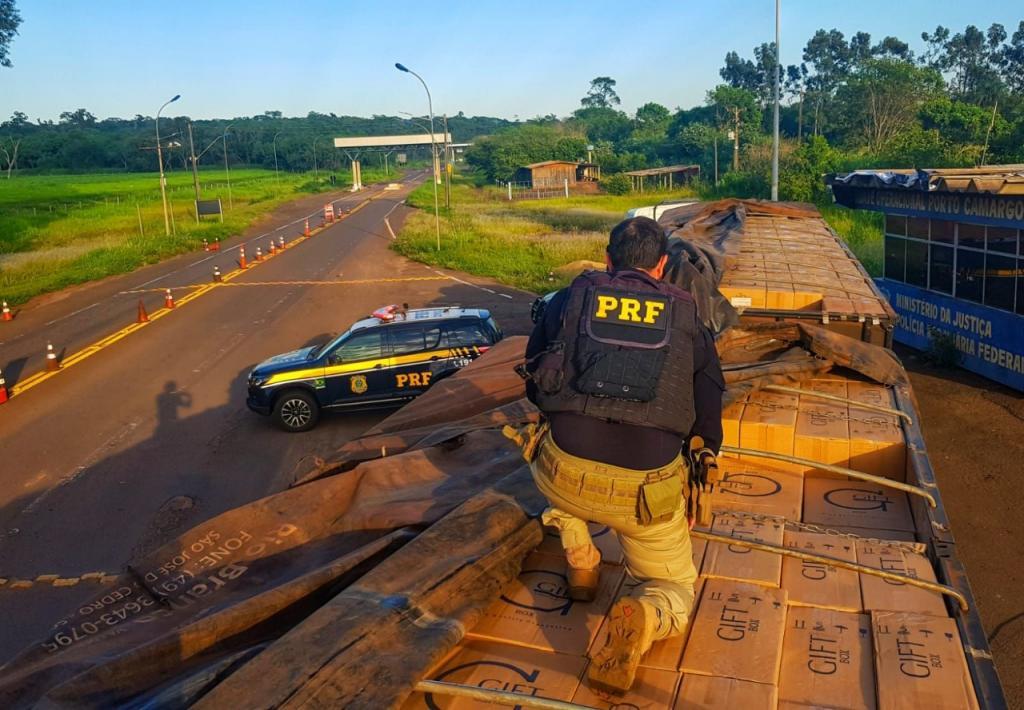 Polícia Rodoviária Federal (PRF) apreendeu no inicio da manhã desta terça (26), em Alto Paraiso, na região oeste do estado, cerca de 600 mil maços de cigarros contrabandeados do Paraguai que eram transportados num rodotrem roubado por um homem que fugiu da abordagem policial e abandonou o veículo no mato às margens da BR-487.