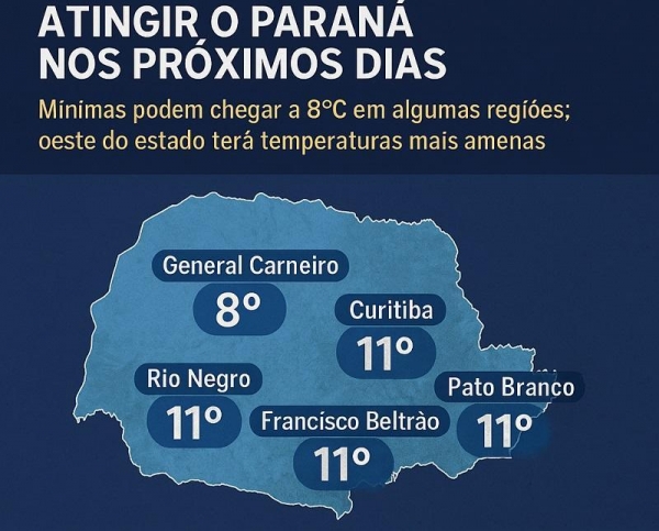Em cidades como General Carneiro, no sul do estado, a mínima deve chegar a 8°C no sábado (5). Em outras localidades, como Curitiba, Rio Negro, Francisco Beltrão e Pato Branco, a previsão é de mínimas em torno de 11°C. Apesar das temperaturas mais baixas, ainda há chance de pancadas isoladas de chuva em algumas áreas do interior.