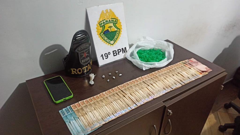 Com o rapaz foram localizados R$ 2.190,00 em espécie e um aparelho celular, em vistoria ao local onde dispensou a porção, foram localizadas cinco pedras de crack, pesando todas aproximadamente dois gramas.