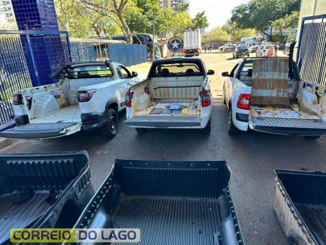 Durante a inspeção, foram localizados fundos falsos nas caçambas dos três automóveis. Dentro deles, havia 416 aparelhos celulares, com valor de R$ 491.314,00.