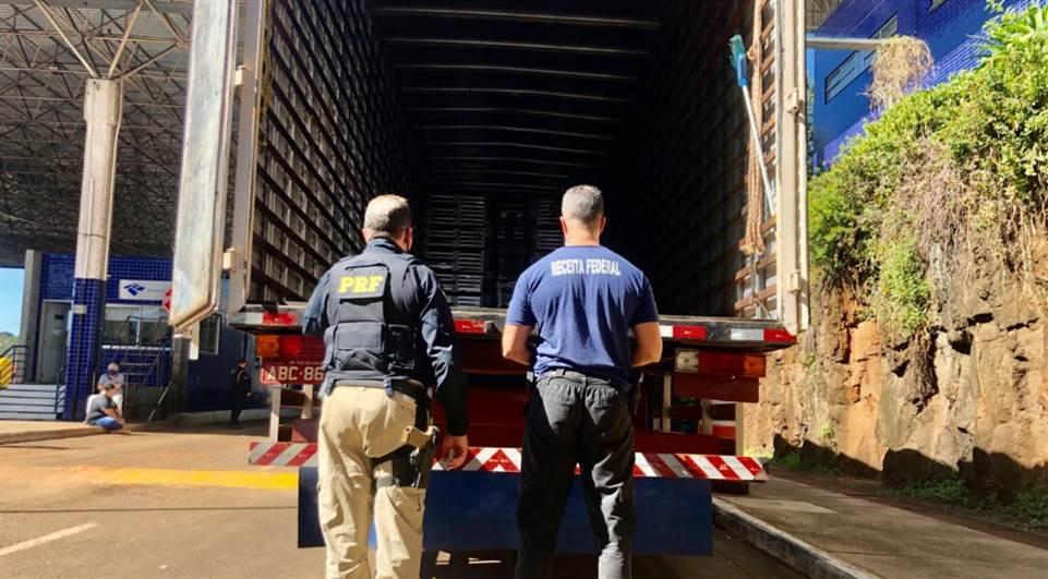 Os agentes realizavam uma fiscalização de rotina e abordaram três caminhões. Durante revista, foram encontrados fundos falsos nos veículos que estavam carregados com produtos, dentre eles eletrônicos, aparelhos celulares. Um dos veículos foi abandonado pelo motorista.