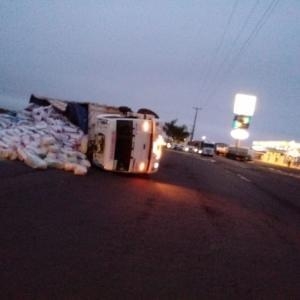 Segundo informações repassadas à reportagem, o caminhão, Ford/Cargo, modelo 2428, seguia sentido Toledo a Marechal Rondon, quando tombou e esparramou toda carga de ração pela via, deixando-a interditada.