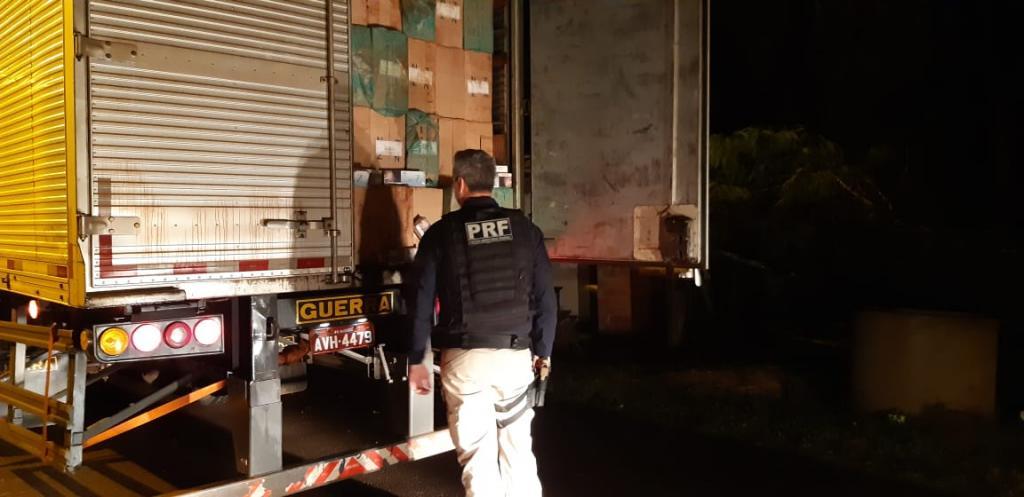 A carga era transportada em um caminhão trator com placas de Araquari/SC, e o semirreboque tipo baú, com placa de Maringá, sendo que o condutor apresentou aos policiais nota fiscal de óleo de soja, contudo foi constatado que na verdade tratava-se de grande quantidade de cigarro, oriunda de contrabando do Paraguai.