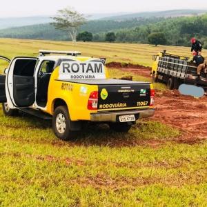 Por volta das 08h50 desta segunda-feira (18), quando em deslocamento pela PRC 272 sentido Iporã a Francisco Alves nas proximidades do Km 518, a equipe de serviço da ROTAM visualizou um caminhão de cor amarela, entrando em uma estrada rural.