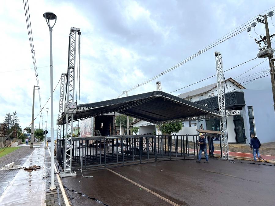 A rua em frente à Prefeitura de Mercedes, Dr. Oswaldo Cruz, está bloqueada para o trânsito de veículos devido à montagem do palco para o Auto de Natal 2024, que ocorrerá na próxima sexta-feira (13).