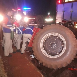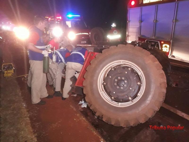 Devido ao forte impacto, o veículo foi arremessado para fora da pista e o trator capotou.