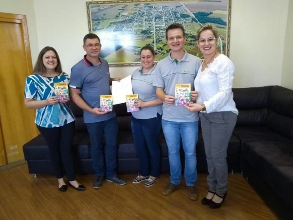 Os gibis, que contam a história de como e de onde vem o dinheiro, foram recebidos no gabinete pela Prefeita Cleci Loffi, Secretário de Educação e Cultura Gilson Backes e pela Coordenadora Pedagógica Kiara Mensch.