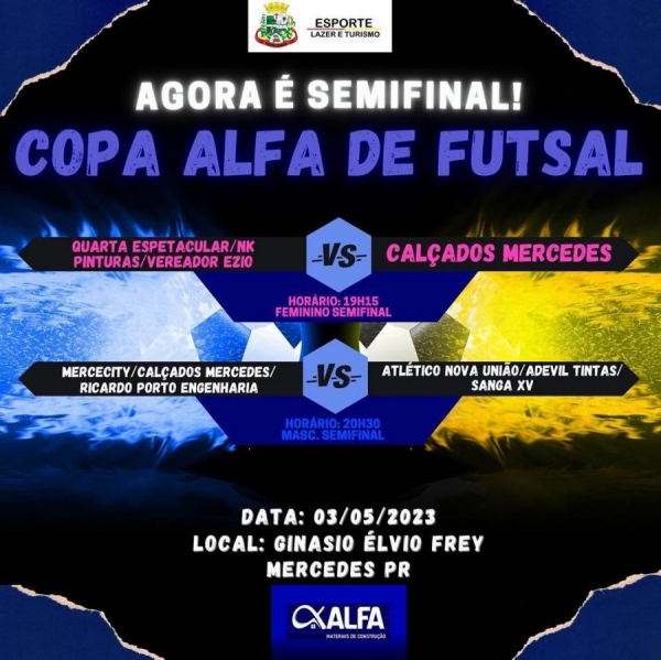 Hoje é noite de decisão na Copa Alfa de Futsal, serão conhecidos os primeiros finalistas da competição. A bola irá rolar no Ginásio Elvio Frey a partir das 19h15.