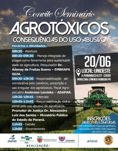 Adapar, Embrapa, Ministério Público do Paraná e Unioeste convidam comerciantes de agrotóxicos, profissionais da agronomia, agricultores e sociedade em geral para seminário “Agrotóxicos, Consequências do Uso Abusivo”, que acontecerá no dia 20 de junho, nas dependências da Unioeste, Rua Pernambuco, em Marechal Cândido Rondon.