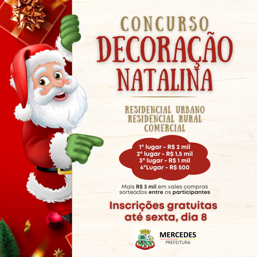 Terminam na próxima sexta-feira (8) às inscrições gratuitas para o Concurso de Ornamentação Natalina em Mercedes. O objetivo é enriquecer o espírito natalino, incentivando os residentes e empresários a decorarem suas casas e estabelecimentos.