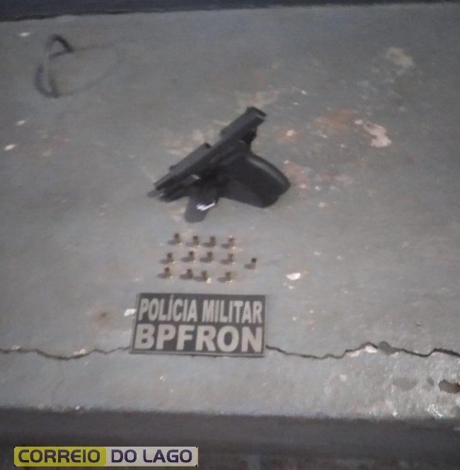 A equipe imediatamente realizou diligencias nas proximidades, quando localizou um dos envolvidos. Com o homem foi localizado uma pistola 9mm com a numeração suprimida, o carregador foi localizado nas proximidades.