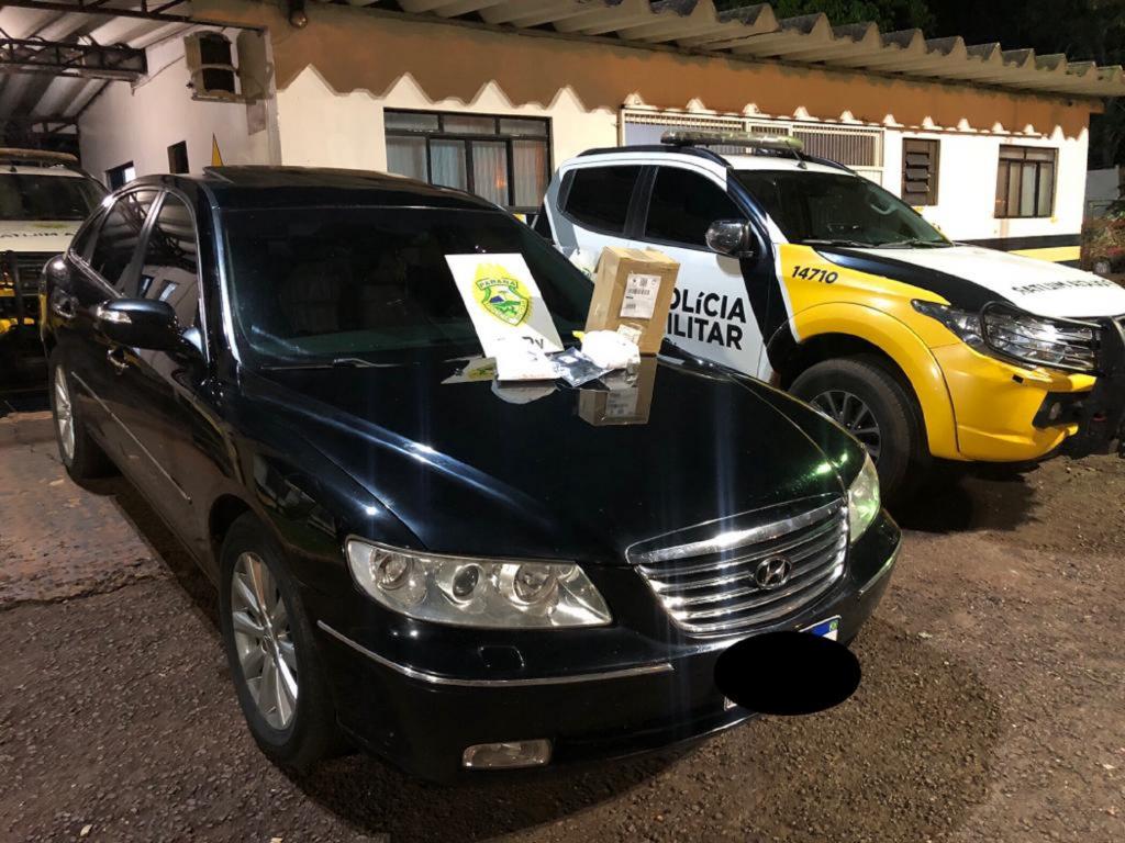 Na abordagem, foi verificado que o condutor, de 29 anos, não possuía CNH e o veículo não estava devidamente licenciado. Diante do nervosismo e das informações desencontradas prestadas pelos outros dois ocupantes, de 25 e 40 anos, a PM localizou em vistoria ao carro, uma caixa de papelão de encomenda. A declaração de conteúdo estava em nome de uma remetente de Volta Redonda-RJ e seu destinatário seria para Cascavel.