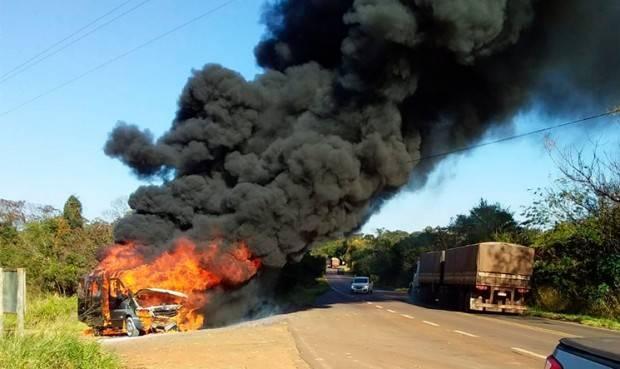 Equipes do 6º Subgrupamento de Bombeiros Militares Independentes (6º SGBI) foram mobilizadas e controlaram as chamas. O veículo, todavia, ficou completamente destruído.