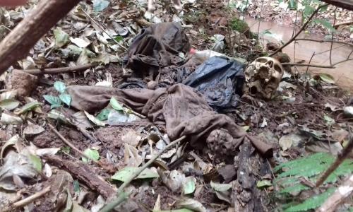 Os restos mortais que aparenta ser um homem, foi localizado ao lado do córrego uma ossada humana, com partes de esqueleto humano, crânio em separado, e outras partes de ossos, envoltas em peças de roupas, sendo camiseta, calça e saco plástico de cor preta, com um chinelo de dedo.